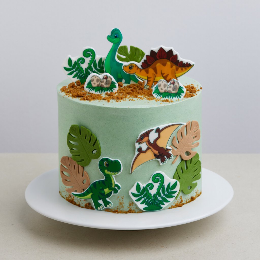 Pripraviť sa na dobrodružstvo z praveku! 🦕 Táto torta s motívom dinosaura je stvorená pre malých objaviteľov, paleontológov a fanúšikov všetkého, čo sa hýbe, vrčí a má chvost. Hravý dizajn s dinosauřími postavičkami, zelenými tónmi a tematickými prvkami vytvorí z každej oslavy malý výlet do doby dinosaurov – samozrejme, s poriadnou dávkou sladkostí.